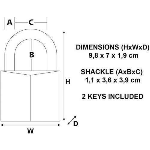 | Intitulé du produit | Cadenas à clé en laiton 170EUR, Longueur: 51 mm, Nb de clés: 2, Anse Ø: 11 mm, Poids du produit: 0.5175 kg |