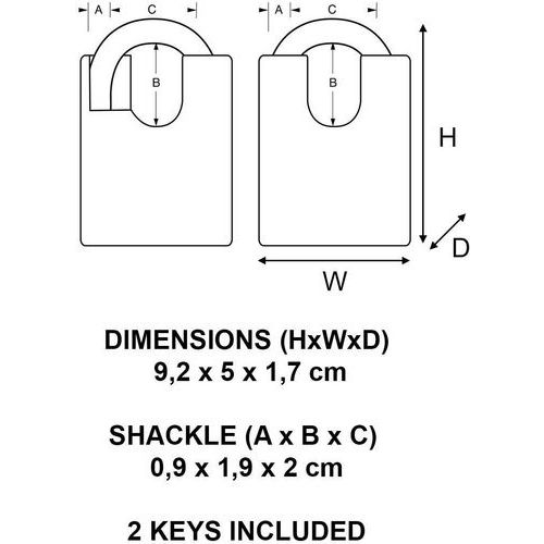 | Intitulé du produit | Cadenas à clé en laiton 2250EURD, Longueur: 63 mm, Nb de clés: 2, Anse Ø: 9 mm, Poids du produit: 0.32835 kg |