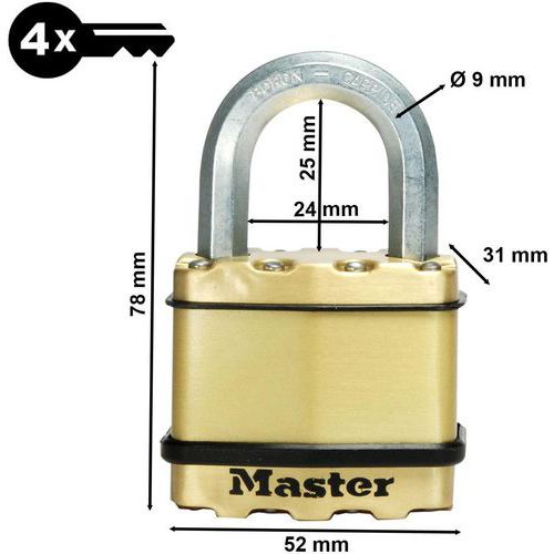 Cadenas à clé en laiton Excell M5BEUR, Longueurs: 44 mm, Nb de clés: 4, Anse Ø: 9 mm, Hauteur: 25 mm
