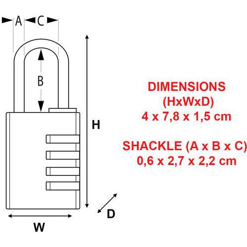 | Intitulé du produit | Cadenas à combinaison en aluminium Program 7640, Anse Ø: 6 mm, Nb de molettes: 4, Longueurs: 78 mm |