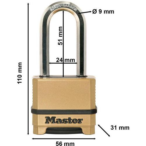 | Intitulé du produit | Cadenas à combinaison en zinc Excell M175EURDLH, Anse Ø: 9 mm, Nb de molettes: 4, Longueurs: 110 mm |