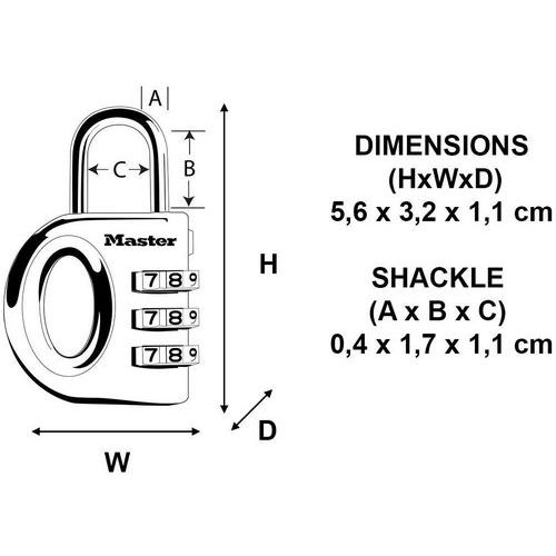 | Intitulé du produit | Cadenas à combinaison multicolor 633EURD, Anse Ø: 4 mm, Nb de molettes: 3, Longueurs: 56 mm, Hauteur: 2.1 cm |
