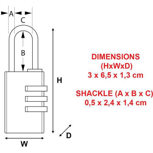 Cadenas à combinaison programmable, Anse Ø: 5 mm, Nb de molettes: 3, Longueurs: 65 mm, Hauteur: 2.9 cm