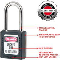 Cadenas de Consignation en Thermoplastique et anse en acier Ø 6 mm pour installations mécaniques. Adapté pour les sites et zones classés ATEX. Avec retenue de clé. Pensez au service LIFEGUARD : service gratuit d’enregistrement des numéros de clés utilisés par une société pour assurer les non doublons de clé dans vos équipes ! Merci de nous le préciser lors de votre commande. Garantie client : À vie