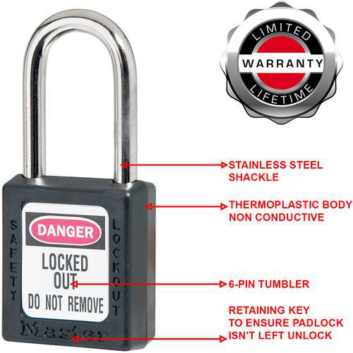 Cadenas de Consignation en Thermoplastique et anse en acier Ø 6 mm pour installations mécaniques. Adapté pour les sites et zones classés ATEX. Avec retenue de clé. Pensez au service LIFEGUARD : service gratuit d’enregistrement des numéros de clés utilisés par une société pour assurer les non doublons de clé dans vos équipes ! Merci de nous le préciser lors de votre commande.