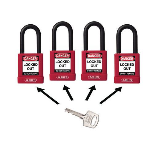 Attention: Un minimum de commande de 2 cadenas est exigé. Chaque cadenas possède 1 clé individuelle qui ouvre tous les autres cadenas commandés. Si vous souhaitez ajouter des cadenas à votre série actuelle il faut utiliser le cadenas de consignation série 74 sur clé modèle.