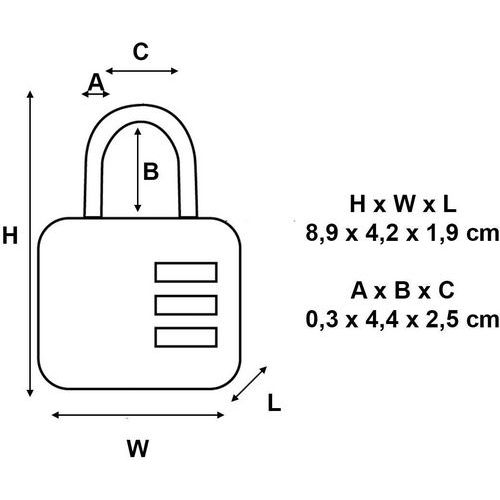 | Intitulé du produit | Cadenas porte-adresse multicolor 4671EUR, Anse Ø: 3 mm, Nb de molettes: 3, Longueurs: 89 mm, Hauteur: 4.7 cm |