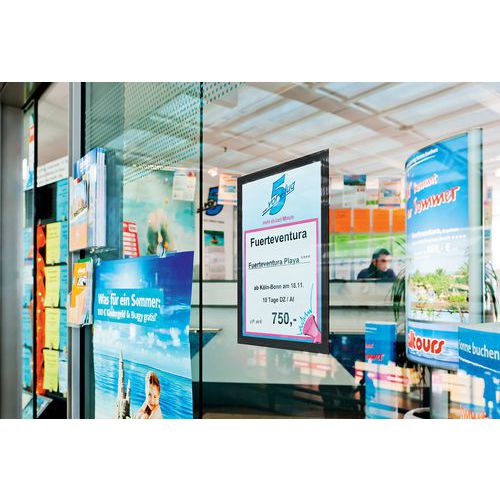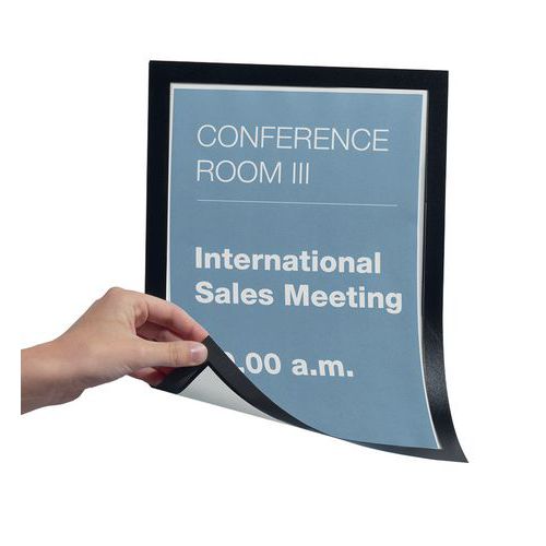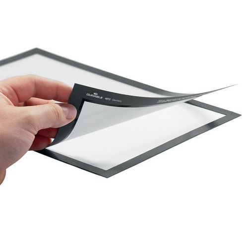Cadre d'affichage adhésif Duraframe® pour surface lisse. Grâce au dos adhésif repositionnable, le cadre se colle et se décolle sur toute surfaces lisses et rigides, comme des murs, des portes… Lisibilité recto-verso du document sur une surface vitrée. Actualisation simple et rapide, maintien des documents grâce à l'encadrement magnétique. Utilisation au format portrait ou paysage. Solution idéale pour afficher les informations générales et obligatoires d'entreprise, les promotions, les règlements intérieurs, les notes d'information etc.