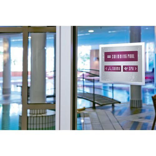 Cadre d'affichage adhésif Duraframe® pour surface lisse. Grâce au dos adhésif repositionnable, le cadre se colle et se décolle sur toute surfaces lisses et rigides, comme des murs, des portes… Lisibilité recto-verso du document sur une surface vitrée. Actualisation simple et rapide, maintien des documents grâce à l'encadrement magnétique. Utilisation au format portrait ou paysage. Solution idéale pour afficher les informations générales et obligatoires d'entreprise, les promotions, les règlements intérieurs, les notes d'information etc.