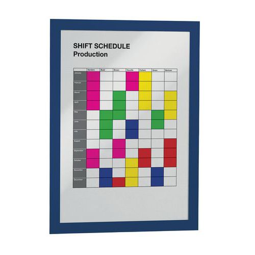 Cadre d'affichage adhésif Duraframe® pour surface lisse. Grâce au dos adhésif repositionnable, le cadre se colle et se décolle sur toute surfaces lisses et rigides, comme des murs, des portes… Lisibilité recto-verso du document sur une surface vitrée. Actualisation simple et rapide, maintien des documents grâce à l'encadrement magnétique. Utilisation au format portrait ou paysage. Solution idéale pour afficher les informations générales et obligatoires d'entreprise, les promotions, les règlements intérieurs, les notes d'information etc.