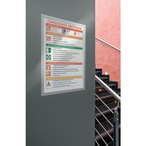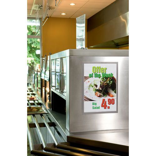 Cadre d'affichage adhésif Duraframe® pour surface lisse. Grâce au dos adhésif repositionnable, le cadre se colle et se décolle sur toute surfaces lisses et rigides, comme des murs, des portes… Lisibilité recto-verso du document sur une surface vitrée. Actualisation simple et rapide, maintien des documents grâce à l'encadrement magnétique. Utilisation au format portrait ou paysage. Solution idéale pour afficher les informations générales et obligatoires d'entreprise, les promotions, les règlements intérieurs, les notes d'information etc.
