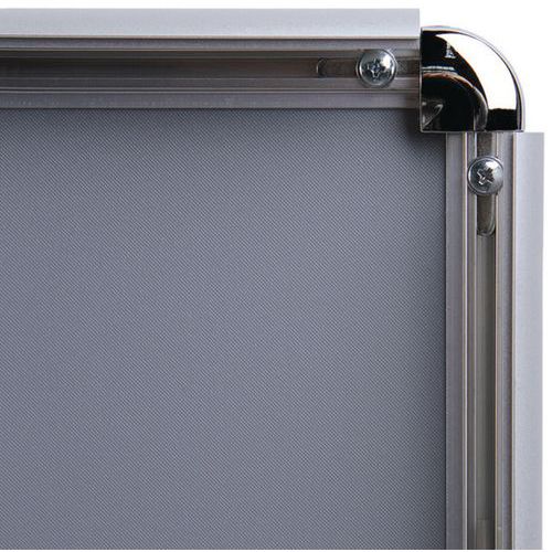 Support d'affichage résistant en aluminium. Facilité d'utilisation: le support d'affichage s'insert et se retire aisément en ouvrant et refermant les 4 bordures profilées du cadre en aluminium. Le contenu d'affichage reste protégé et accessible. Angles arrondis pour davantage de sécurité.