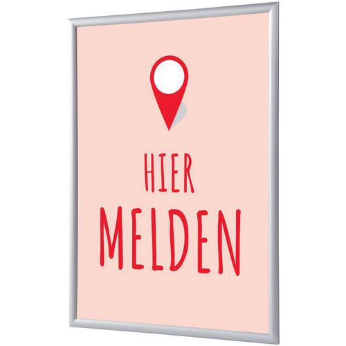 Cadre Clic-clac S'inscrire ici - Néerlandais. Ensemble complet de cadres avec fixation et visuel. Visuel standard. Papier Premium 135 g/m2 pour poster, format A1. Profilé de 25 mm avec coins biseautés.