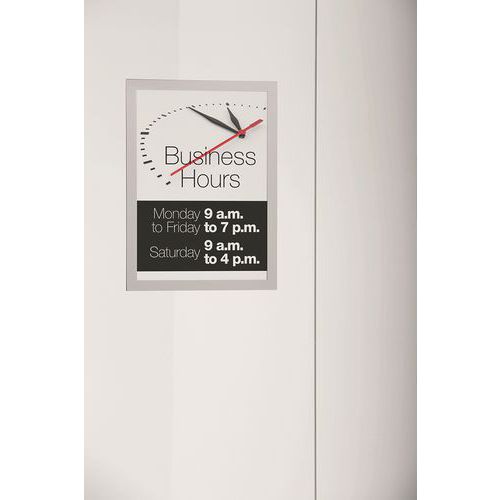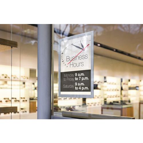 Cadre pour l'affichage de documents prix, horaires d’ouverture, promotions… Cadre d'affichage Duraframe® Sun, spécialement conçu pour les surfaces vitrées exposées au soleil. Grâce à sa fixation vitrostatique, le cadre peut se fixer sur des vitrines, fenêtres, vitres etc. Insertion et actualisation rapide de l'affiche grâce à l'encadrement magnétique. Résistant à la chaleur (jusqu'à 70°C) et possède un traité anti UV efficace jusqu'à 2 ans. Avec film antireflet. Couleur du cadre identique de chaque côté. S'utilise au format portrait ou paysage. Conçu pour l'affichage d'information et de publicité.