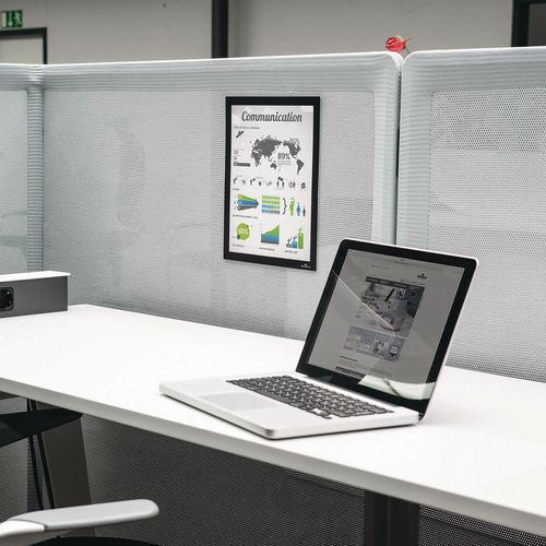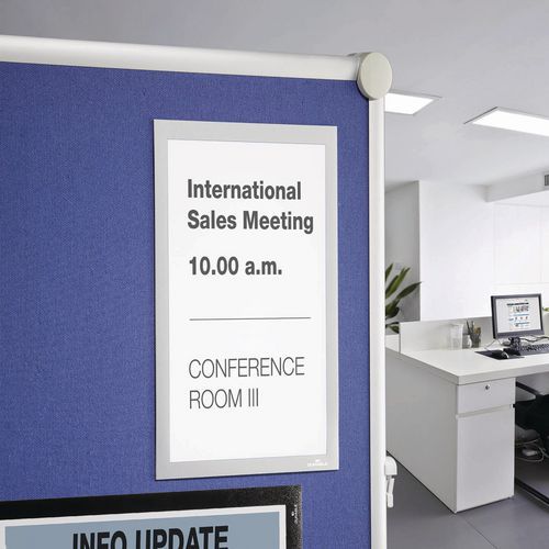 Les documents peuvent être changés rapidement et facilement, car le cadre pliable se ferme de façon magnétique.