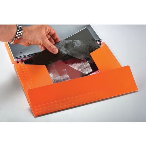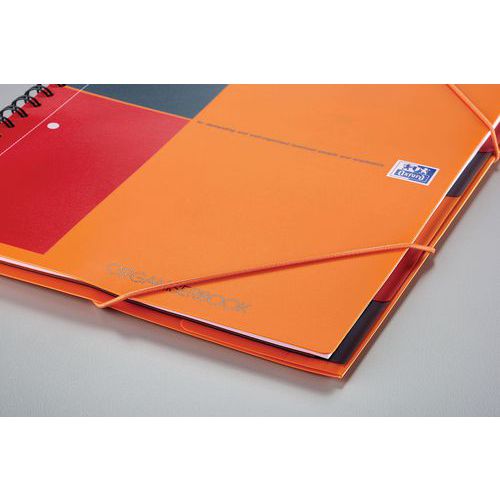 Une chemise 3 rabats à fermeture élastique est intégrée à la fin du cahier pour transporter vos notes et documents en toute sécurité.