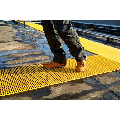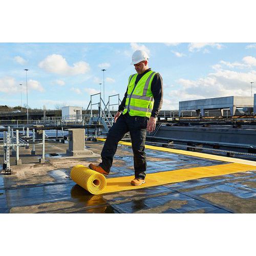 Caillebotis PVC flexible gris pour chemins techniques sur toits plats, portiques routiers et hautes passerelles.