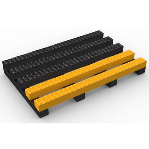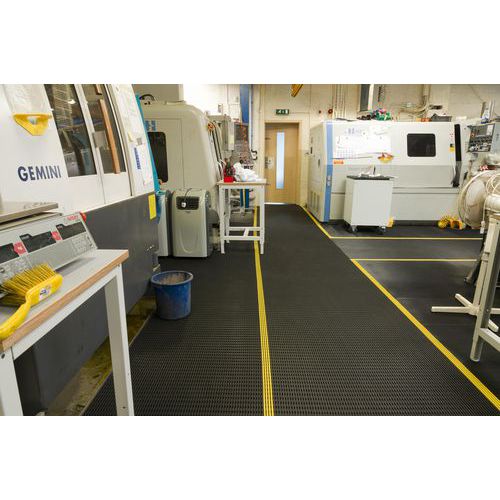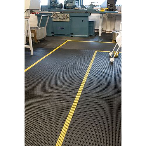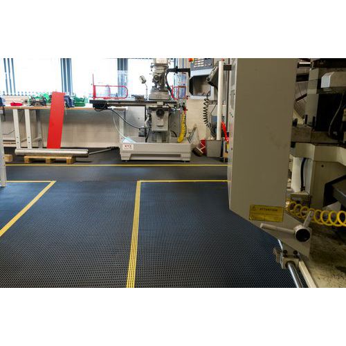 Caillebotis souple antidérapant et antifatigue au mètre linéaire. Excellent drainage des fluides et des petits débris. Bordure jaune biseautée facilitant les passages. Surface antiglisse de type pointe de diamant. Productivité augmentée et fatigue réduite.