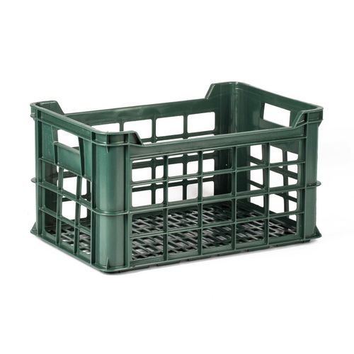 Caisse adaptée au stockage des fruits et légumes. La perforation permet à l'air de pénétrer dans les aliments et d'évacuer les liquides indésirables. Fabriqué en regranulat, la charge maximale est de 15 kg. Résistant aux huiles, résines et alcalis.