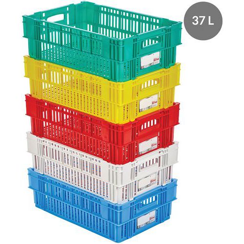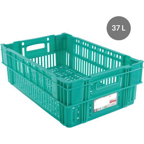Aération du contenu. Empilable et emboîtable par rotation d'un demi-tour.