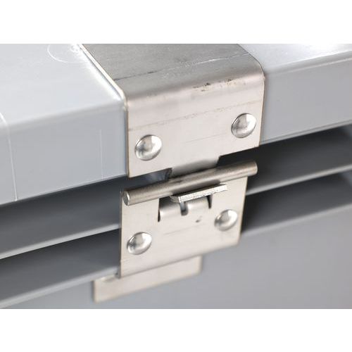 Caisse-palette de transport agréée ADR/UN type 11H2/Y. Box compatible matières dangereuses de classe II et III. Serrure à clé triangulaire : fermeture parfaite et sûre. Couvercle à charnières inox renforcées et amovibles. Caisse-palette à parois pleines et lisses et fond plein.