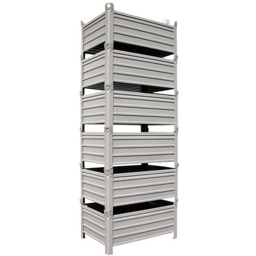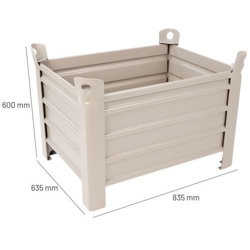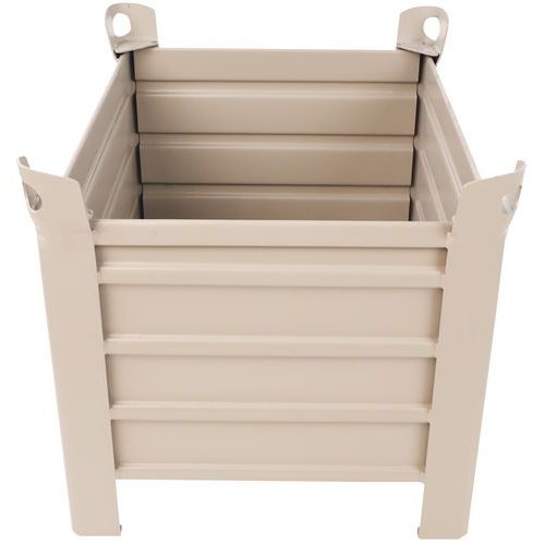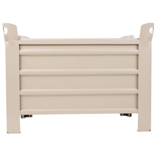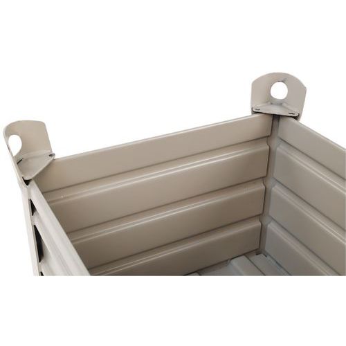 Ultra-résistante en tôle d'acier nervurée. Caisse-palette à parois pleines. Gain d'espace, avec une capacité d'empilage de 5 caisses-palettes. Grande stabilité du gerbage avec profils d'angle montants. Convient aux industries mécaniques, automobiles, fonderies ou collecte de déchets. Version élingable. Épaisseur tôle : fond 2 mm, paroi 1,5 mm, cornière 4 mm.