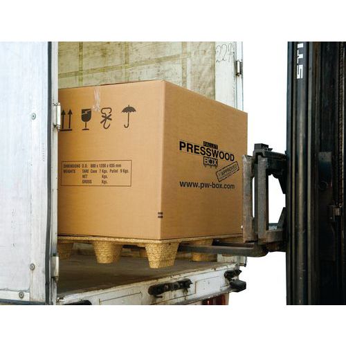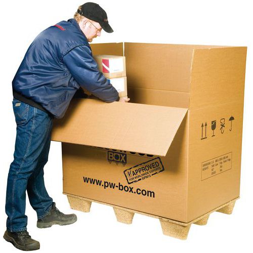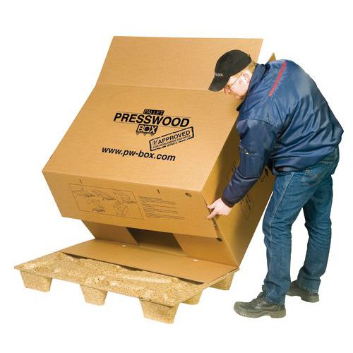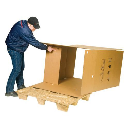 Ouverture sur le côté : chargement plus facile. Palette sans clous ni vis pour plus de sécurité. Montage simple et rapide sans cerclage. Boîte sur palette légère et réutilisable. Excellente protection des produits.