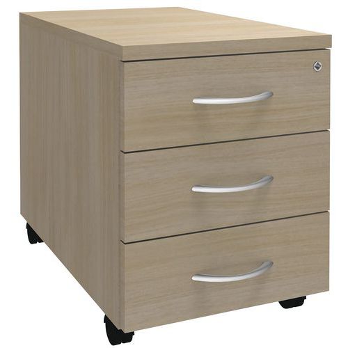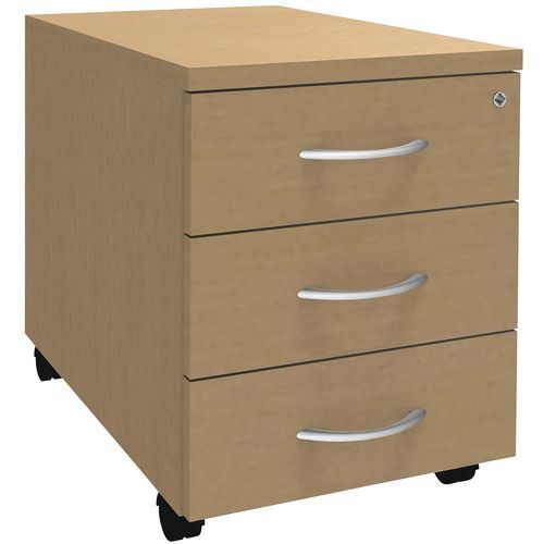 Tiroirs à ouverture sélective anti basculement Tiroirs sur glissières à galets. Serrure centralisé avec clé pliante. Plumier amovible dans tiroir haut. Modèle 2 tiroirs (dont 1 pour dossiers suspendus) avec 5ème roulette anti basculement) ou 3 tiroirs. L/H/P : 43 x 60 x 56 cm. Fabriqué en France. Livré monté.