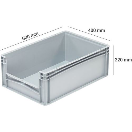 | Intitulé du produit | Bac norme Europe à ouverture frontrale, Capacité: 44 L, Gerbable: oui, Hauteur hors tout: 220 mm |