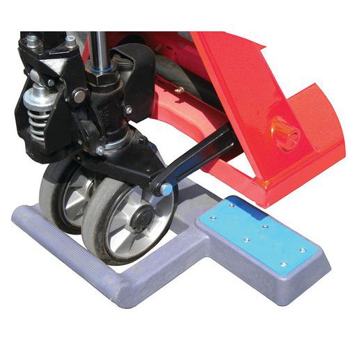| Intitulé du produit | Cale pour transpalette, Hauteur: 8 cm, Poids: 3.6 kg, Largeur: 390 mm, Longueur: 690 mm, Coloris: Bleu/gris |