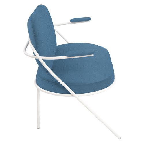 Design contemporain Seconde Vie : Possibilité de changer assise et dossier pour une durée de vie infinie, non déhoussable Empilable Structure: tube Ø20 mm en acier 100% recyclé, finition époxy Assise: panneau contreplaqué, épaisseur 12 mm Garniture assise: mousse polyuréthane 30 kg/m3, épaisseur 70 mm Garniture dossier: mousse polyuréthane 30 kg/m3, épaisseur 60 mm Garniture accoudoir: mousse polyuréthane 30 kg/m3, épaisseur 15 mm
