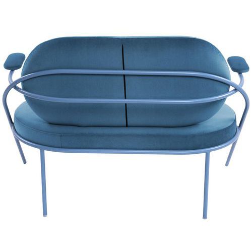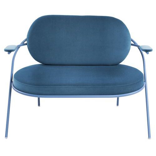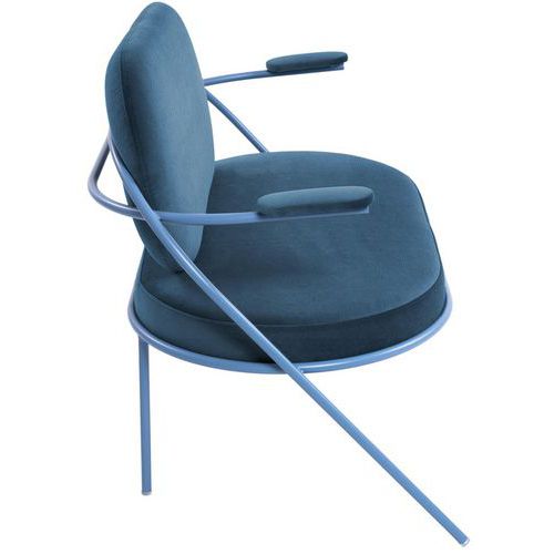 Design contemporain Seconde Vie : Possibilité de changer assise et dossier pour une durée de vie infinie, non déhoussable Empilable Structure: tube Ø20 mm en acier 100% recyclé, finition époxy Assise: panneau contreplaqué, épaisseur 12 mm Garniture assise: mousse polyuréthane 30 kg/m3, épaisseur 70 mm Garniture dossier: mousse polyuréthane 30 kg/m3, épaisseur 60 mm Garniture accoudoir: mousse polyuréthane 30 kg/m3, épaisseur 15 mm