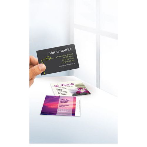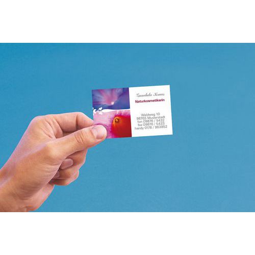 | Intitulé du produit | Cartes de visite, Grammage: 185 g/m², Hauteur: 54 mm, Nb de pièces: 250, Largeur: 85 mm |