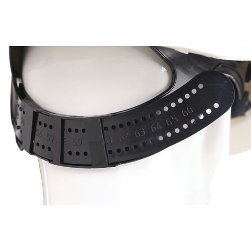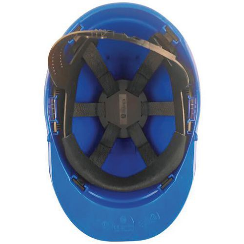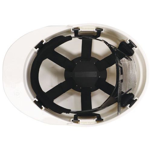 Ce casque moderne à coque à visière possède un harnais interne réglable. C'est une conception résistante de sécurité qui vous protégera des chocs et des intempéries.