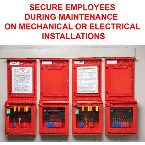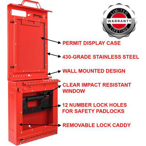 Le centre de consignation présente un tableau d'affichage des autorisations de travail (modèle n° S3501) et une boîte de consignation de groupe pour fixation murale (modèle n° S3502) ainsi qu'une anse pour transport.