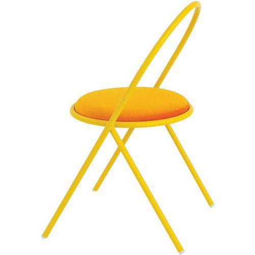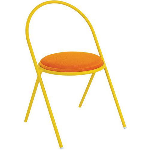 Chaise avec galette en simili-cuir Saturne. Structure avec tube Ø30 mm en acier, finition époxy. Assise à panneau de particules, épaisseur 15 mm. Simili-cuir, non déhoussable. Garniture en mousse polyuréthane 30 kg/m3, épaisseur 30 mm.