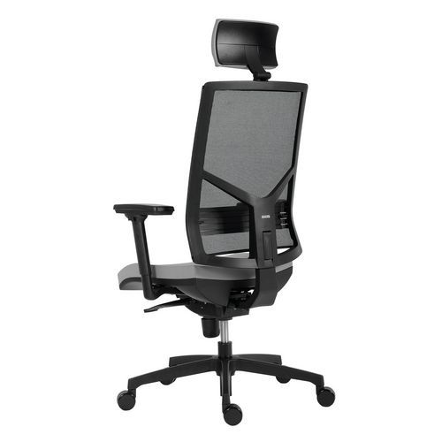 Chaises de bureau pratiques Omnia avec mécanisme synchrone à verrouillage quintuple, avec réglage de la force du contrepoids, appui-tête réglable. Le dossier en résille et le support lombaire réglable en hauteur garantissent une assise confortable même en été.