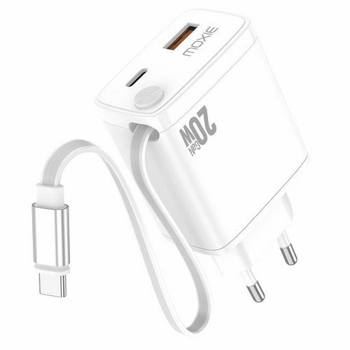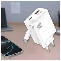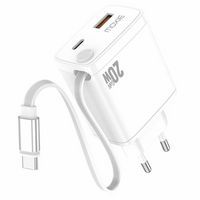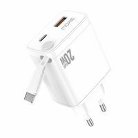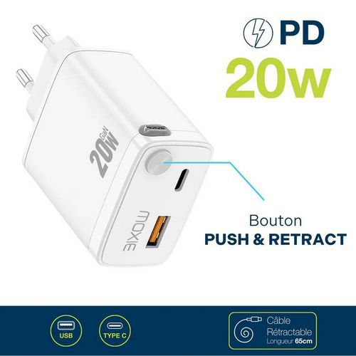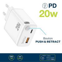 | Intitulé du produit | Chargeur secteur Fast charge 20W cable retractable Type-C, Coloris: Blanc, Poids du produit: 106 g |