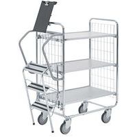 Chariot à échelle avec 3 plateaux, stable à utiliser pour la préparation de commandes dans l'entrepôt.