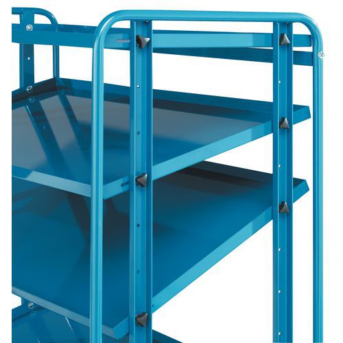Robuste, structure mécano-soudée renforcée. Chariot pour bacs avec plateaux tôle solides. Réglage au pas de 100 mm.