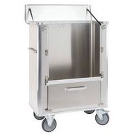 Chariot conteneur en aluminium pour une utilisation universelle.  Hygiénique, sans odeur et ne rouille pas.  Utilisation facile et ergonomique, même avec une charge maximale.  Surface lisse, parois non nervurées permettant un nettoyage facile.  Paroi rabattable maintenue en position ouverte grâce à deux aimants.  Couvercle à charnières, 2 sangles de maintien et 2 fermetures à levier.   Fond incliné avec 2 orifices d’évacuation, les deux orifices d’évacuation munis de soupape d’évacuation, bouchon et chaînette.  Fond étanchéifié avec du silicone.  Poignées anodisées sur les deux parois frontales.