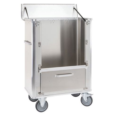 Chariot conteneur en aluminium pour une utilisation universelle. Hygiénique, sans odeur et ne rouille pas. Utilisation facile et ergonomique, même avec une charge maximale. Surface lisse, parois non nervurées permettant un nettoyage facile. Paroi rabattable maintenue en position ouverte grâce à deux aimants. Couvercle à charnières, 2 sangles de maintien et 2 fermetures à levier. Fond incliné avec 2 orifices d’évacuation, les deux orifices d’évacuation munis de soupape d’évacuation, bouchon et chaînette. Fond étanchéifié avec du silicone. Poignées anodisées sur les deux parois frontales.