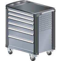 Capacités de charge optimales 40 kg par tiroir, 400 kg pour le bâti Utilisation optimale Grâce à l’extension totale et la hauteur frontale optimale des tiroirs Sécurité parfaite au travail Fermeture centrale et sécurité individuelle ou double sur les tiroirs et contre les ouvertures involontaires en cours de route Grande souplesse d’adaptation Avec paroi latérale et arrière perforées pour la fixation d’accessoires et de crochets à outils Grand confort d’utilisation Avec barre de poussée ergonomique et stable Mobilité totale Grâce aux deux roulettes souples fixes et aux deux roulettes pivotantes en caoutchouc plein Surface de dépose et de travail supplémentaire Avec revêtement en bois résistant ou en plastique antidérapant et compartiments pour petits objets Sécurité supplémentaire Grâce à la protection des coins en plastique résistant jouant le rôle d’amortisseurs