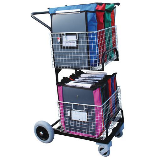 Chariot de distribution de courrier compact avec poignée ronde. Corbeilles de dimensions utiles L450 x P400 x H180 mm. Charge admissible 25 kg par corbeille. 2 roues arrière diam 200 mm. 2 roulettes directrices à l’avant diam. 100 mm. Chassis tubulaire en acier mécano-soudé avec revêtement époxy. Corps de roues en polypropylène, bandage en mousse polyuréthane sur roulements.
