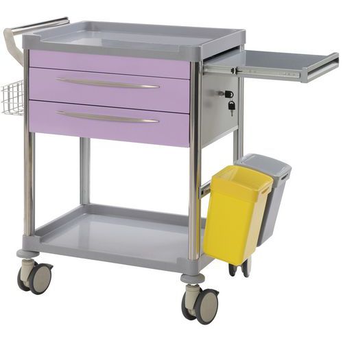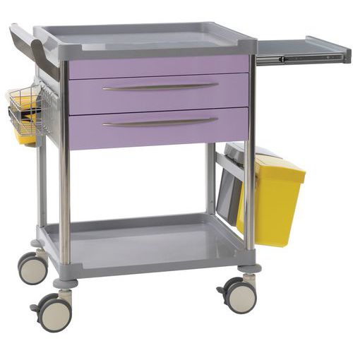 Composé de : 1 chariot de soins 2 tiroirs, 1 panier filaire, 1 support boîte à aiguilles, 1 tablette coulissante, 1 serrure centrale à clé, 2 poubelles, 3 jeux de séparateurs en polycarbonate pour tiroirs.