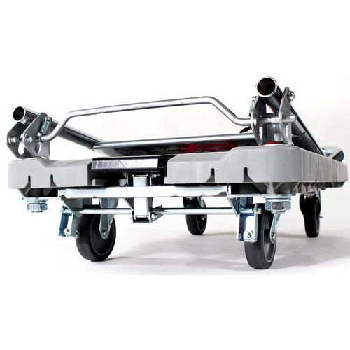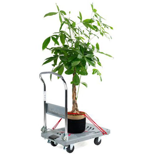 - Chariot à plateforme à freins muni d'un levier rabattable.