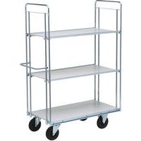 Chariot haut avec 3 plateaux renforcés ajustable en hauteur avec supports. Construction robuste, convient pour le transport longue distance avec capacité de 500 kg. Equipée de deux roulettes fixes et deux roulettes pivotantes.