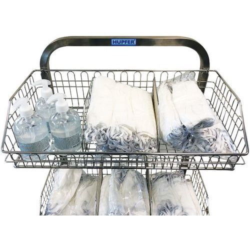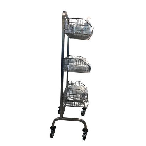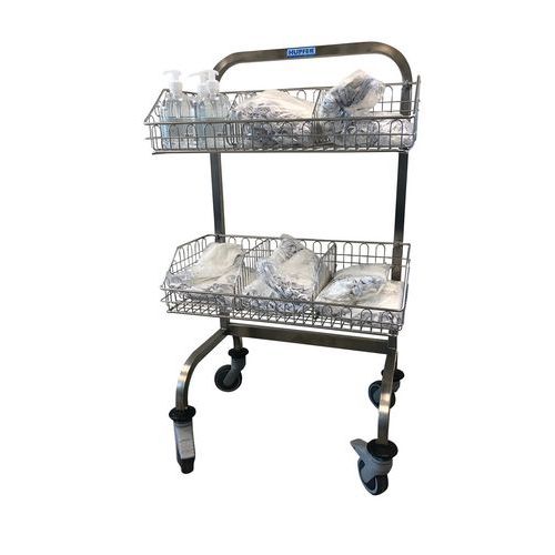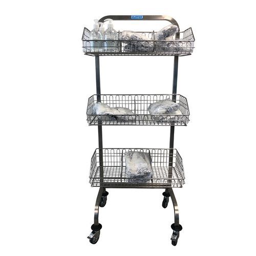Chariot médical entièrement en acier inoxydable haut de gamme, structure monocoque solide et hygiénique. Equipé de 2, 3 ou 4 paniers en inox pour le transport, stockage et distribution de produits stériles dans des emballages souples. Entretien simple avec de l'eau du robinet et un nettoyant liquide dégraissant ou un nettoyant pour acier inoxydable. Doté de 4 roulettes pivotantes anti-chocs dont 2 avec frein. Resecte les règles sanitaires liées au Covid-19 grâce à sa fabrication en inox connue, entre autres, pour ses propriétés hygiéniques. Chariot compatible avec les recommandations de sécurité sanitaires