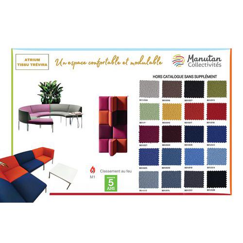 Chauffeuse Atrium avec mousse polyuréthane sur assise et dossier pour plus de confort. Revêtement tissu 100% polyester Trévira CS classé non feu M1. Mousse assise 10 cm, dossier 6 cm. Structure siège panneau de particules. Piètement métal coloris gris. Hauteur assise 42 cm. 4 pieds tube métal 20 x 20 x 2 mm, avec patins. Livrée montée.
