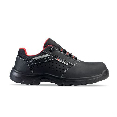 Chaussures de sécurité basses Perforées Focus 2.0 Perfo. Semelle en PU2D, très légère, flexible, très bon amorti, résistance au glissement (SRC), résistance aux huiles et aux hydrocarbures. Tige perforée très respirante, cuir nubuck huilé. Embout composite, amagnétique, plus léger que l’acier, non conducteur du chaud et du froid. Semelle anti-perforation composite, amagnétique, légère, souple, non conductrice du chaud et du froid. Semelle de propreté anatomique, EVA avec dessus textile, perforée, absorbeur de chocs au talon en EVA.